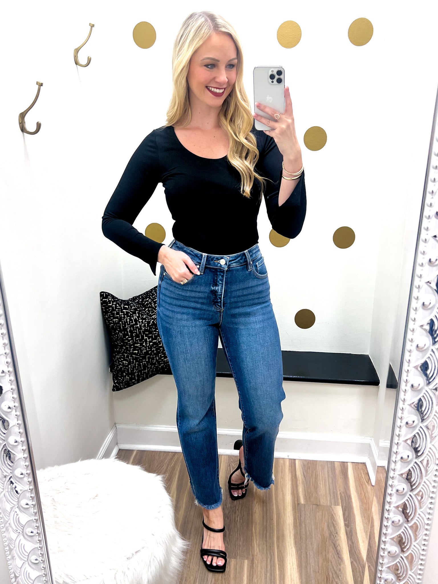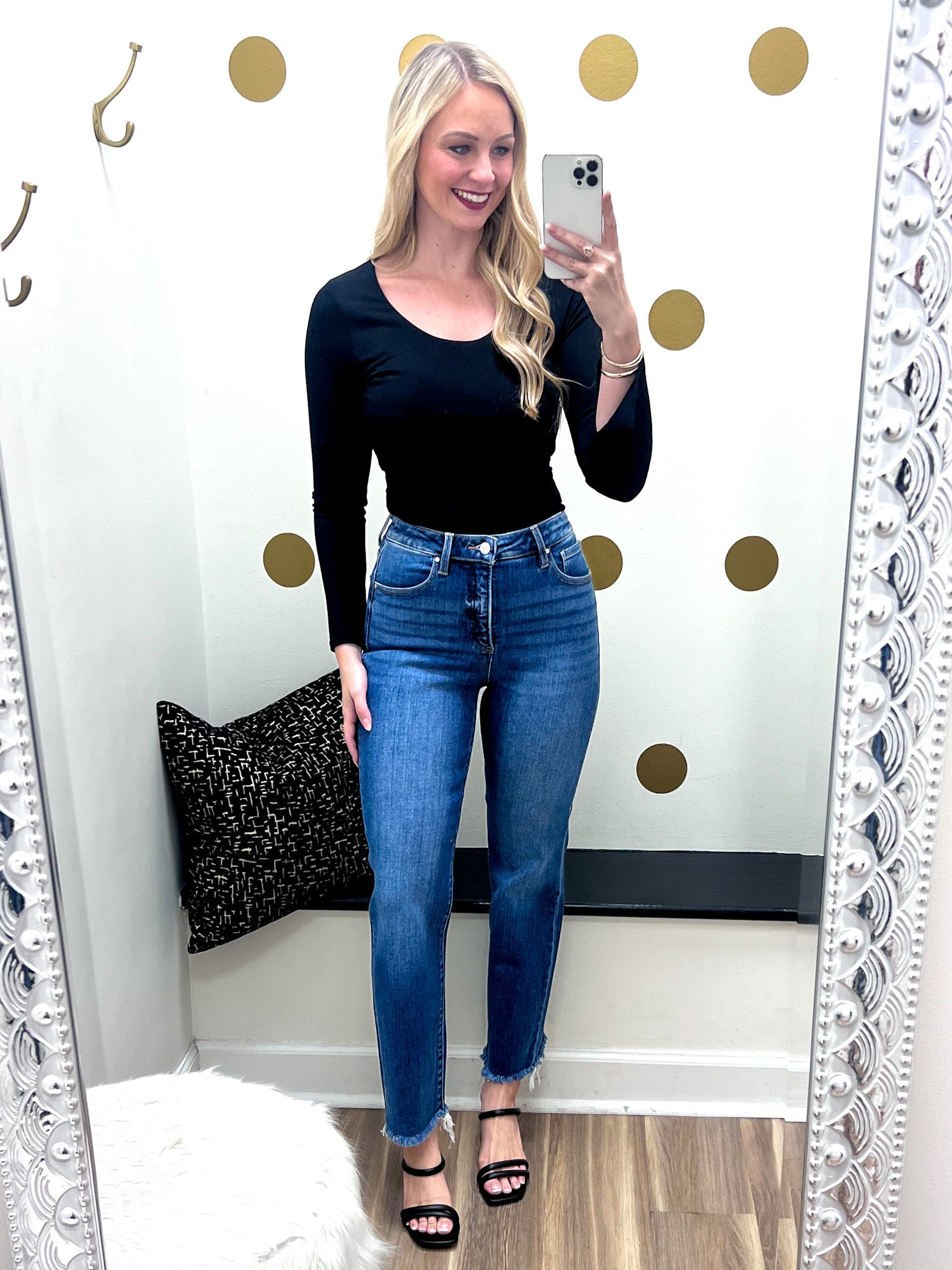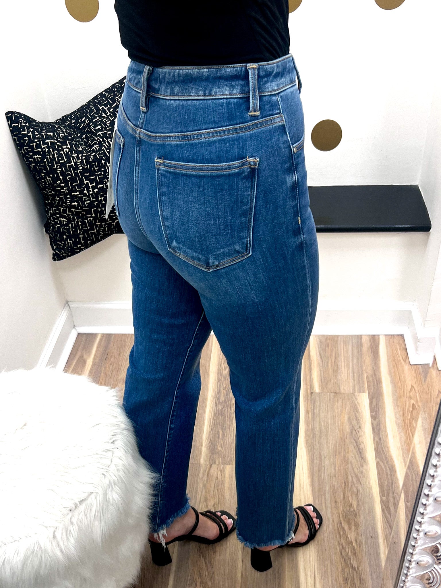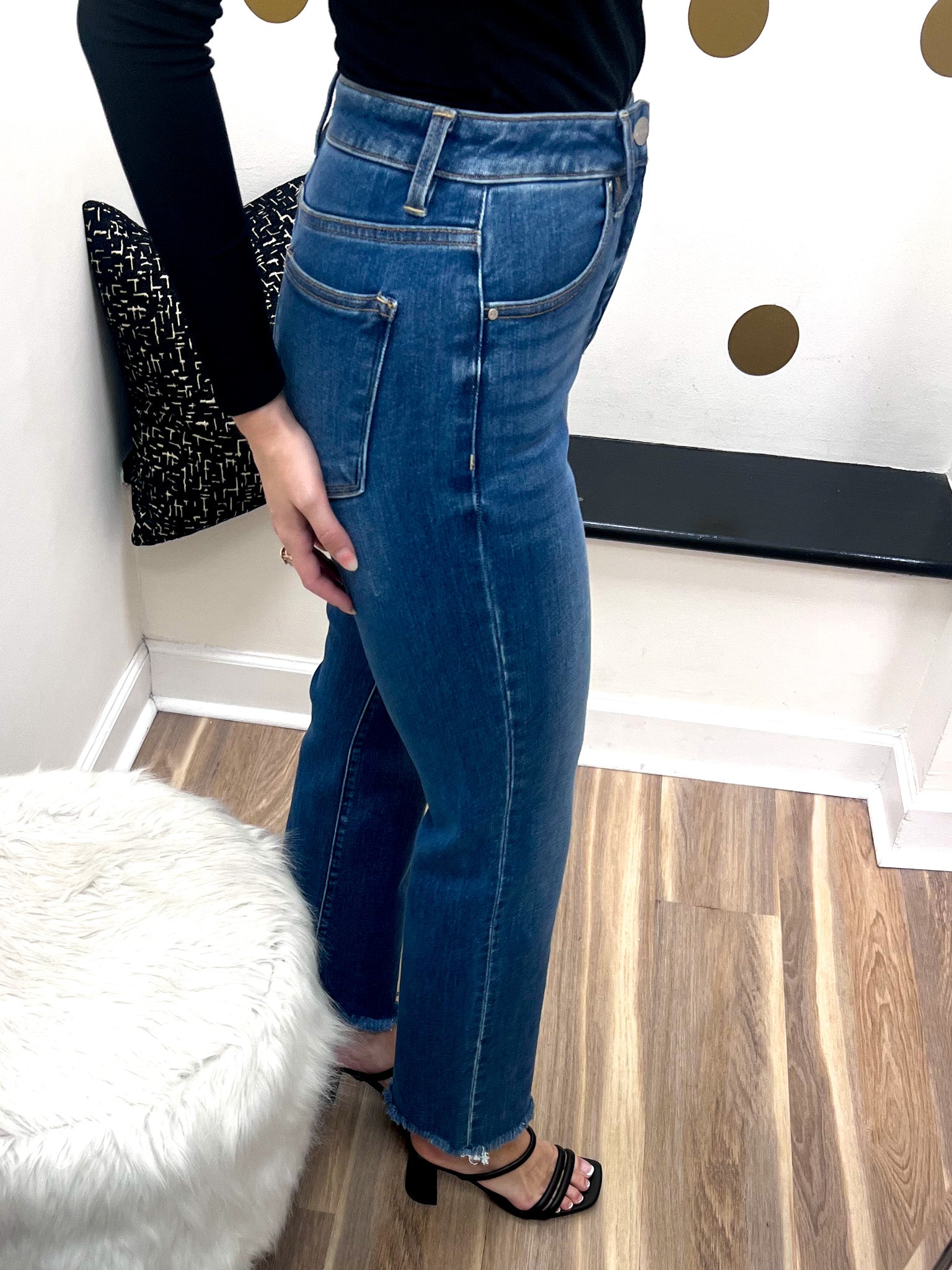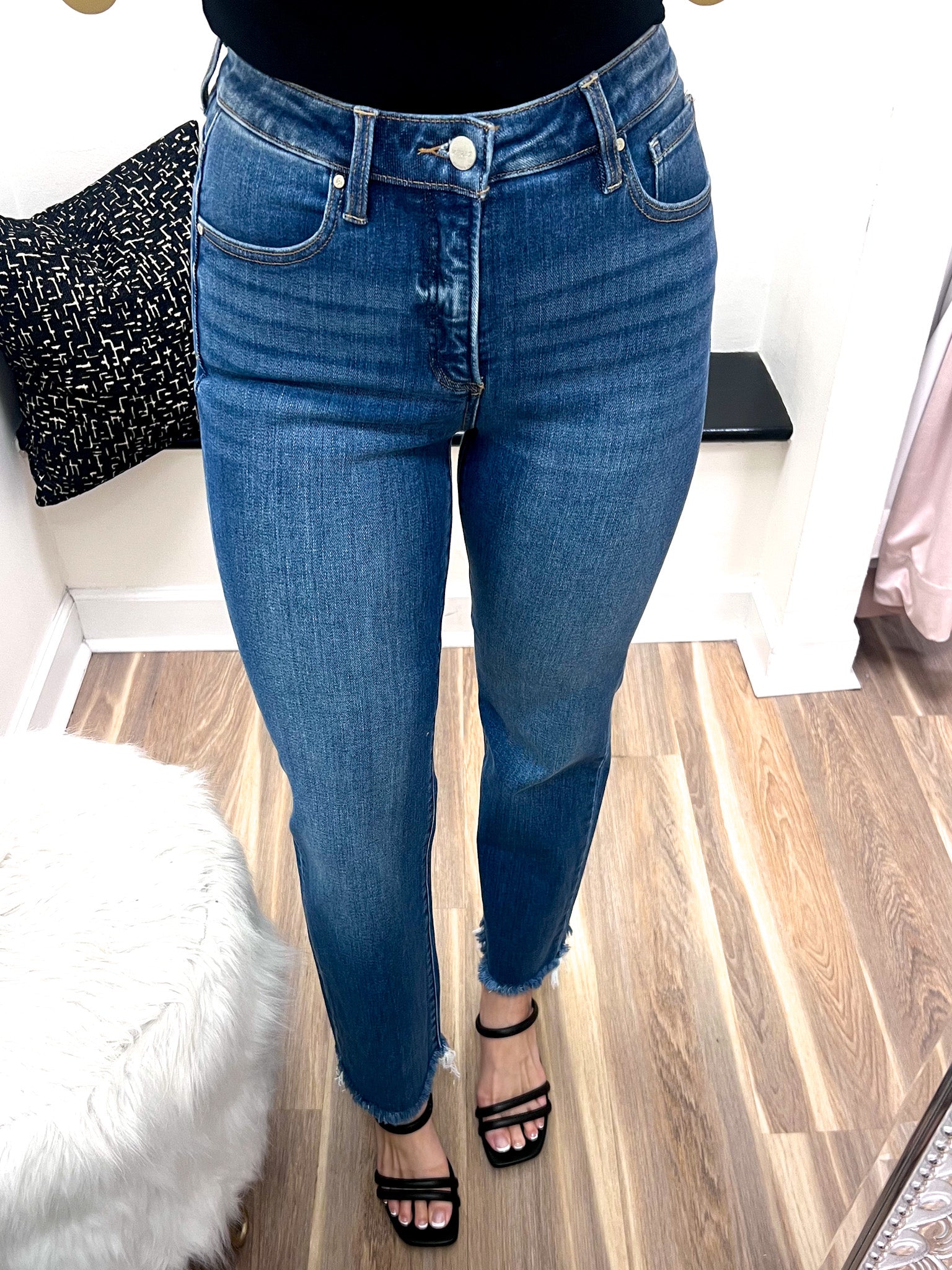 Step into style with the Amanda Jeans—a perfect blend of comfort and chic. These medium wash jeans feature a high-rise fit with tummy control to flatter your silhouette, while the cropped straight leg and raw cut hem add a trendy edge. Whether you're dressing up or down, these jeans keep you looking playful and polished all day long.