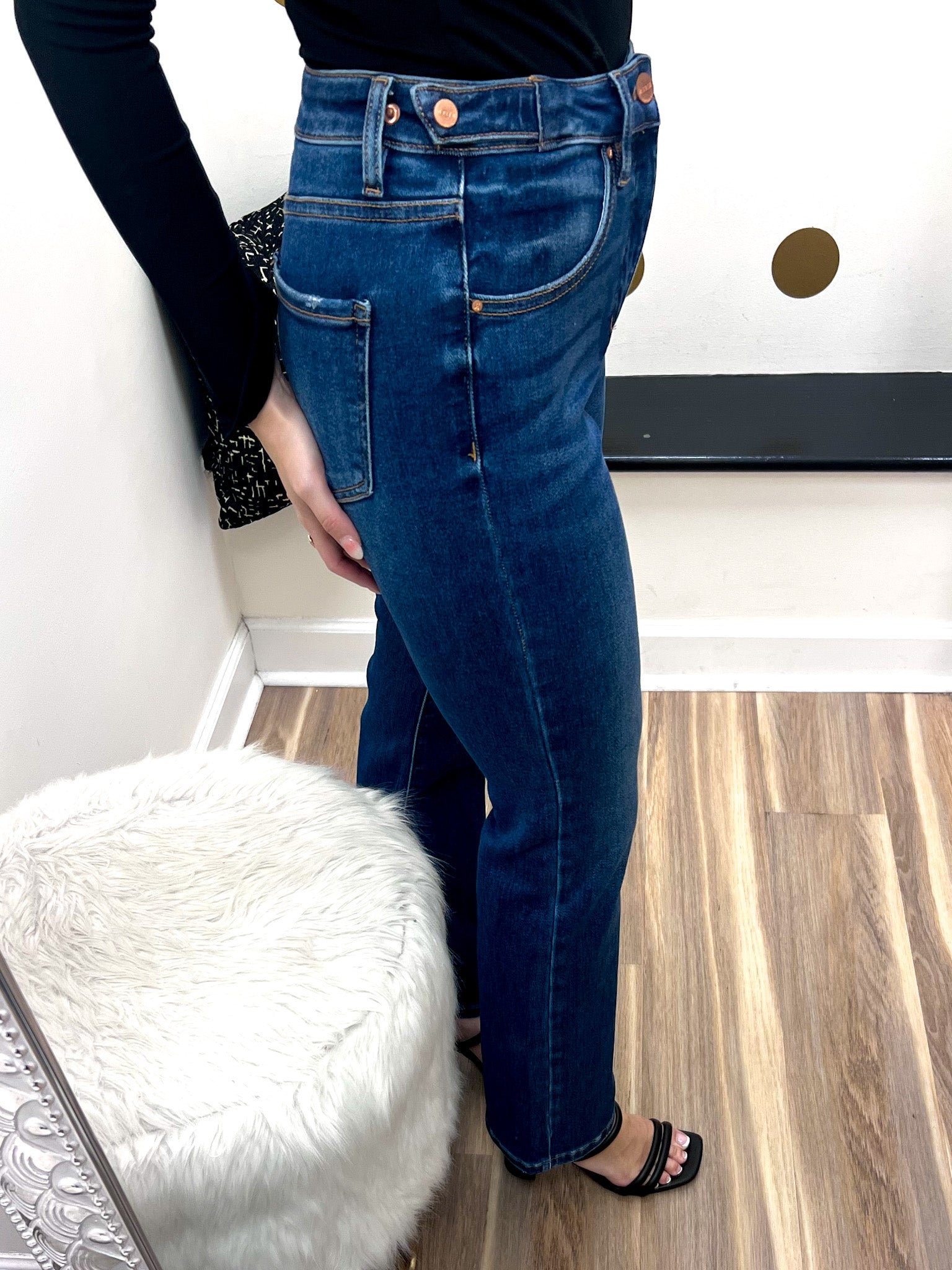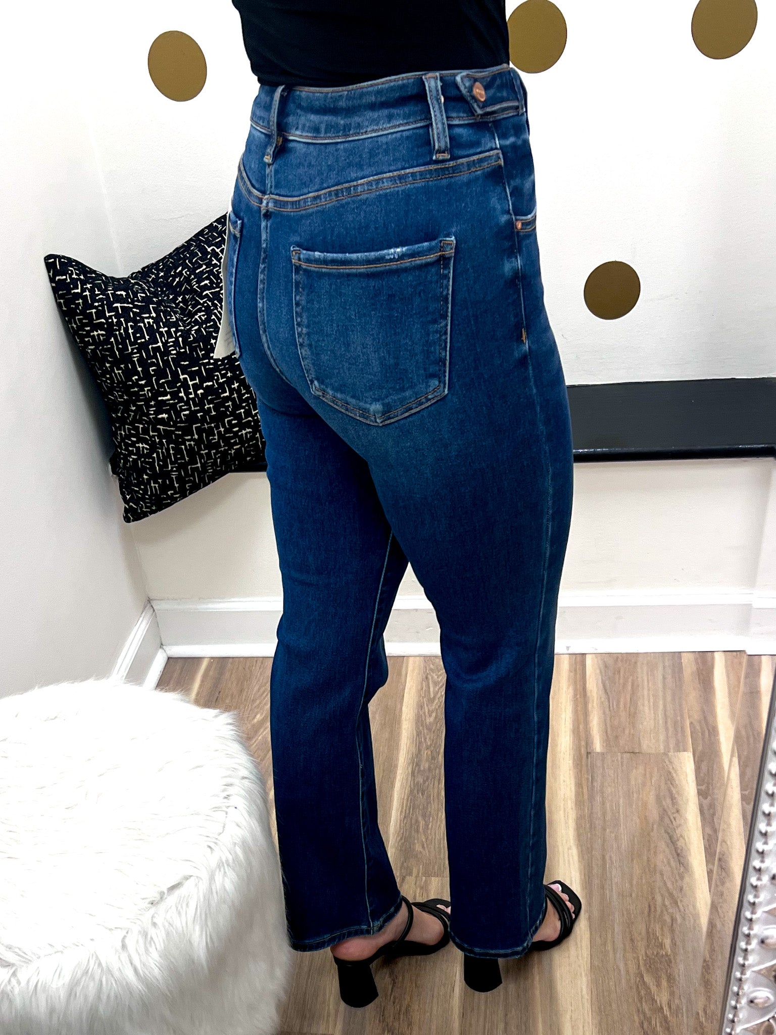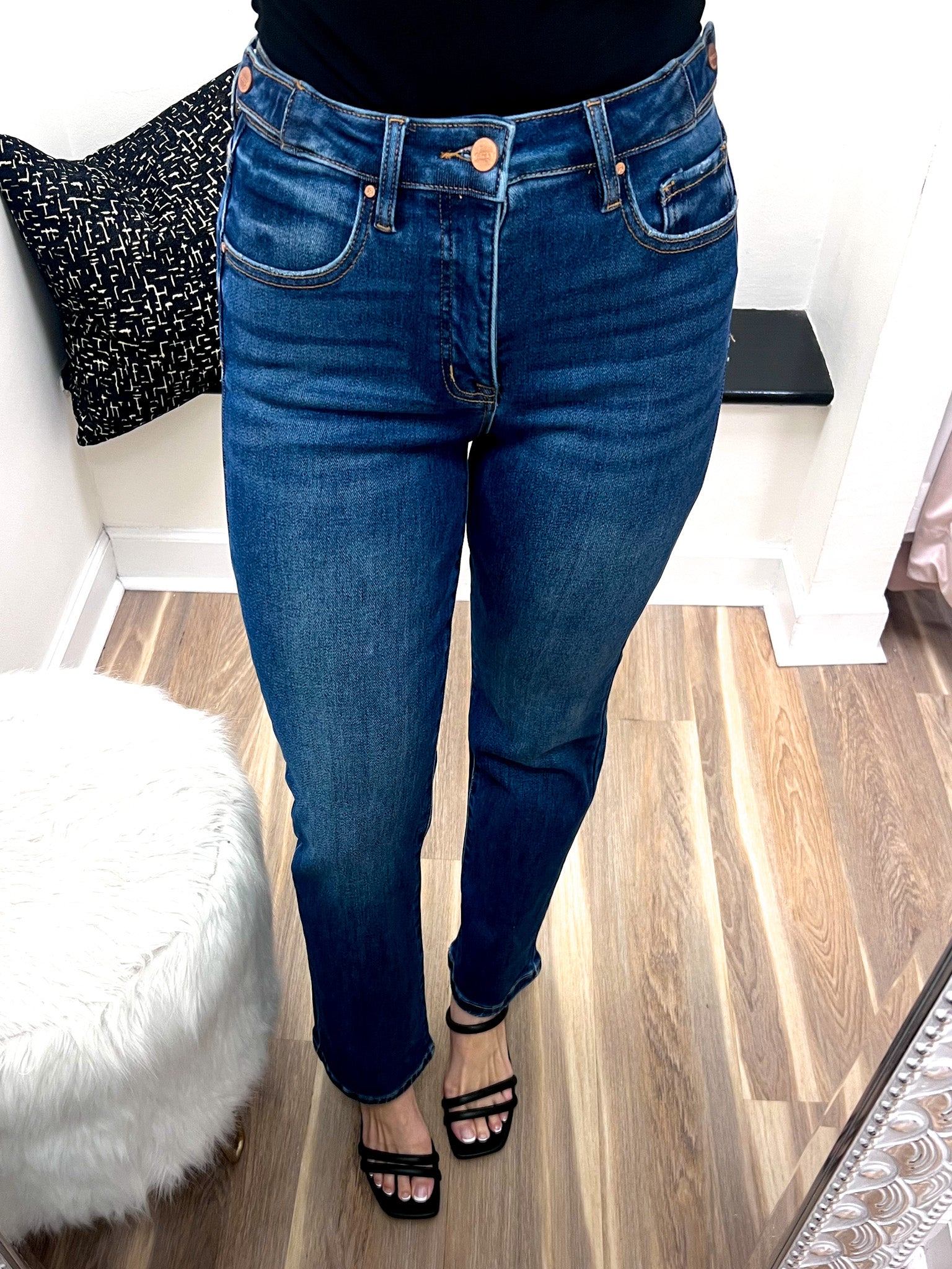 Slip into the Hanna Jeans for a fun and flattering twist on your denim game. These dark wash jeans feature a high rise with tummy control to keep you feeling confident all day. The adjustable waist band lets you customize your fit perfectly, while the ankle straight cut adds a playful edge to any outfit. Perfect for mixing and matching into your everyday wardrobe!
