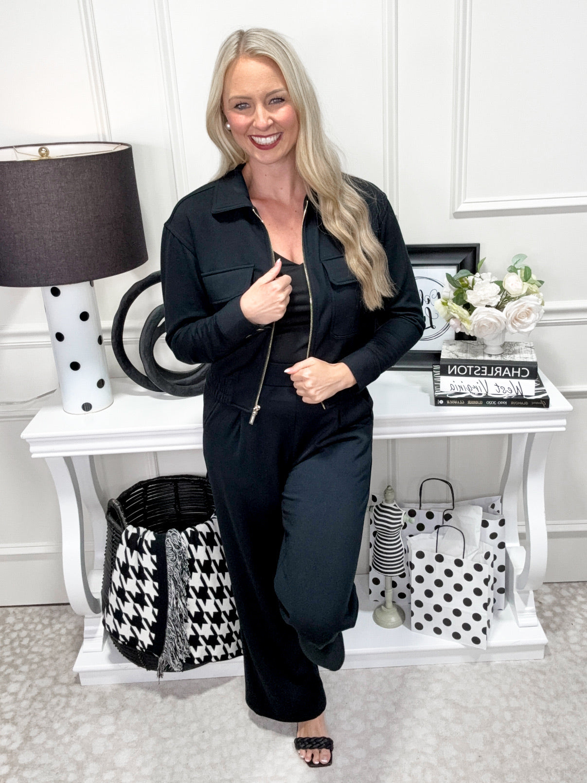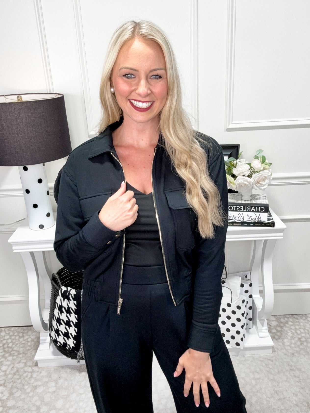 Stay cozy and stylish in the Annalise Jacket! This black fleece features a chic collar and shiny gold zipper hardware that adds a touch of glam. Zip it up for warmth, while the elastic waist hem ensures a snug, flattering fit. Handy front chest pockets keep your essentials close, making this jacket perfect for playful adventures or casual days out.