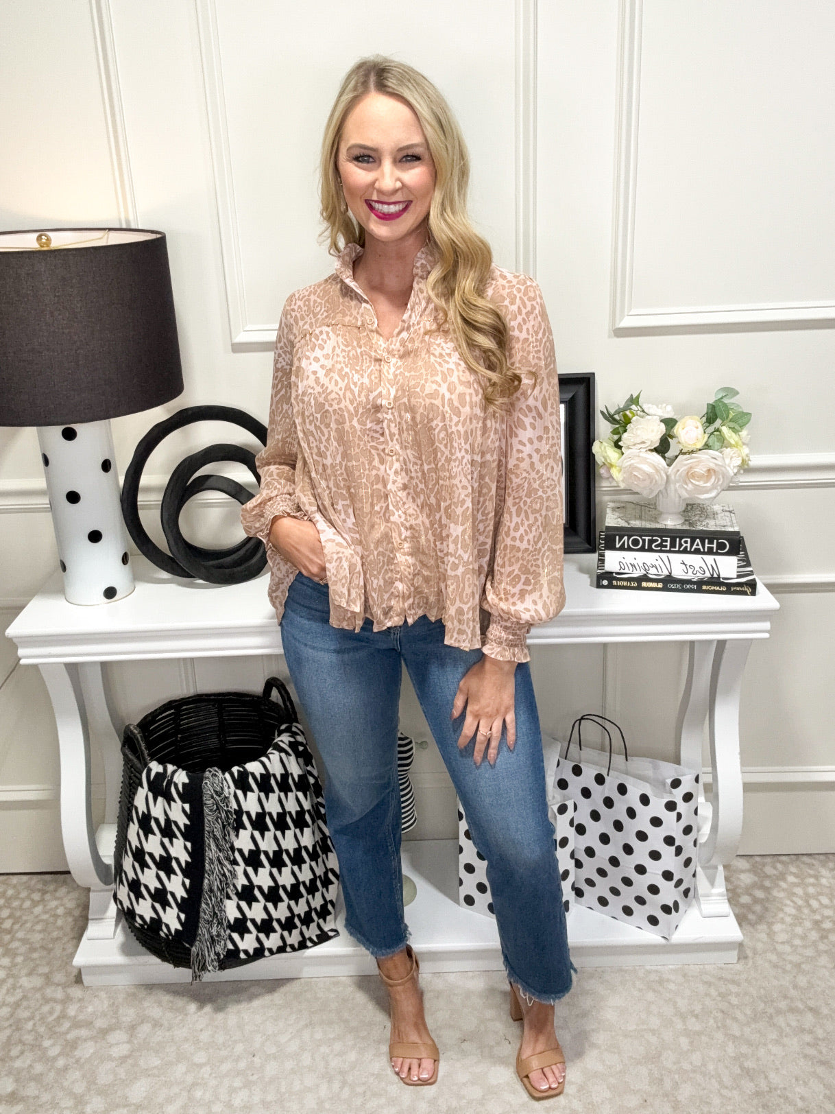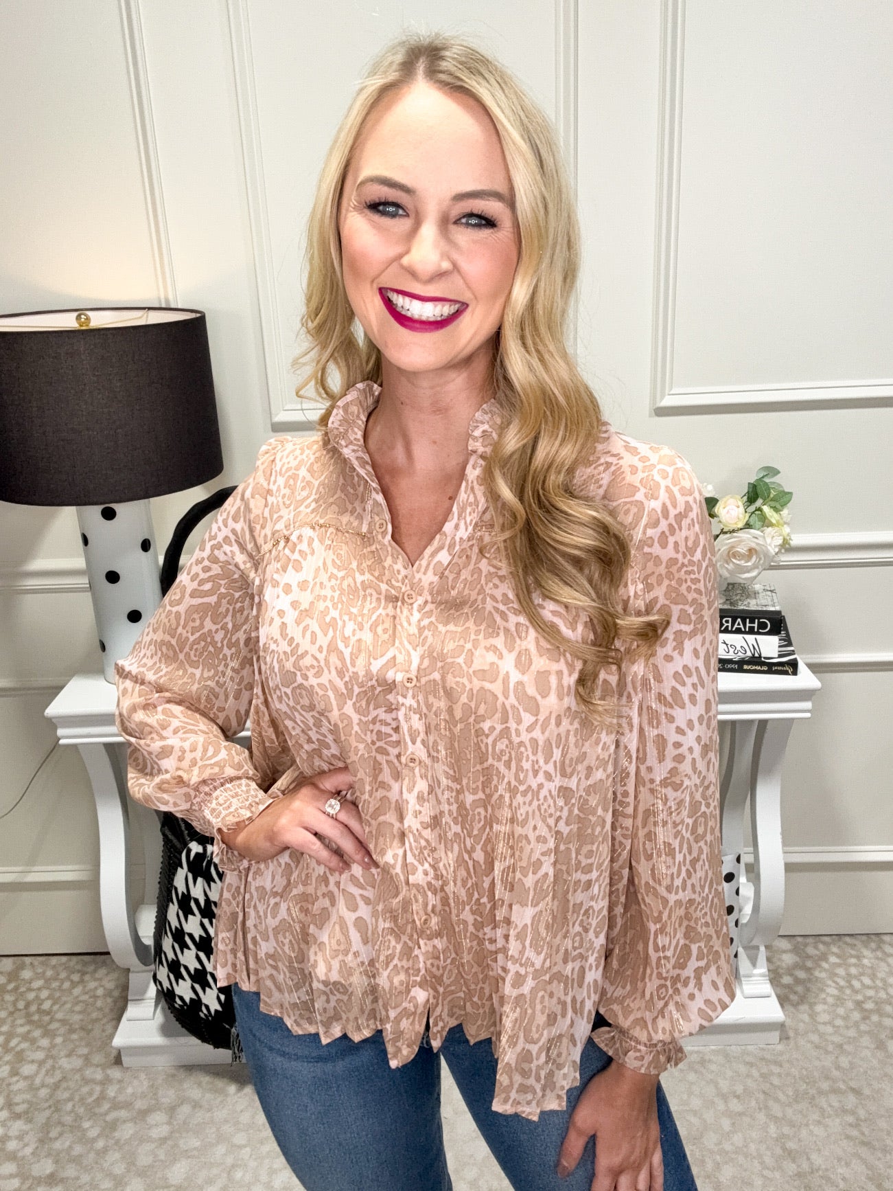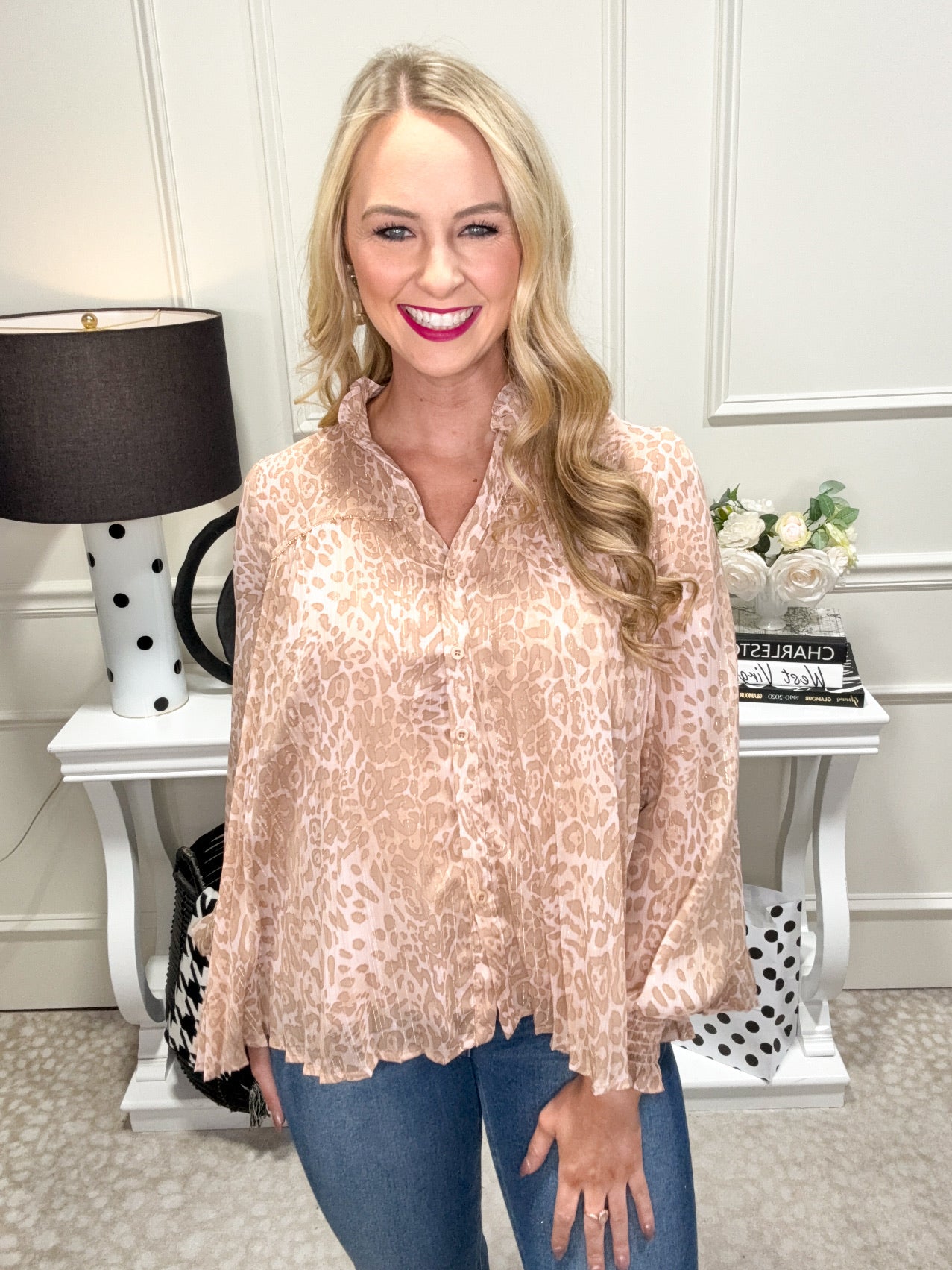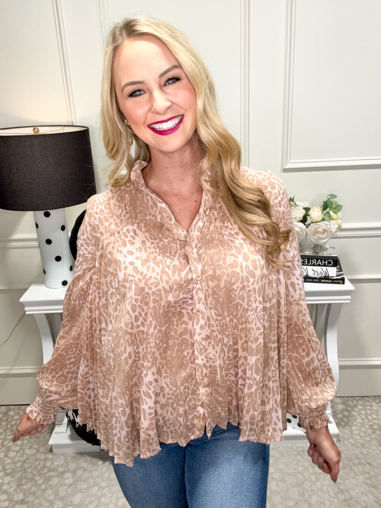 Bring a wild twist to your wardrobe with the Aubrey Top. This playful blouse features airy chiffon printed with a bold animal pattern, while shimmering lurex pleats add a touch of sparkle and movement. Perfect for dancing through your day or turning heads at night, it’s where fierce meets fun in effortless style.