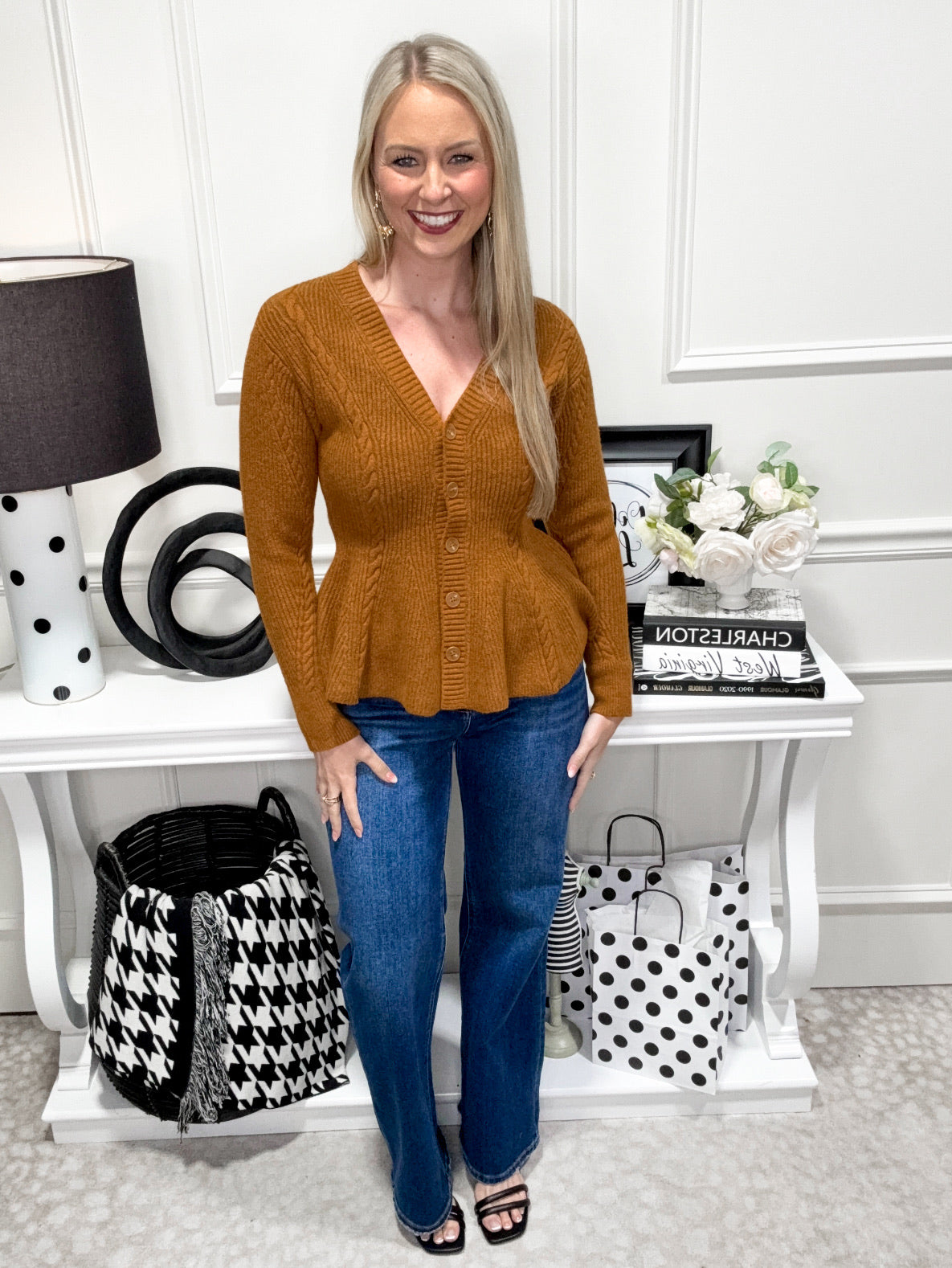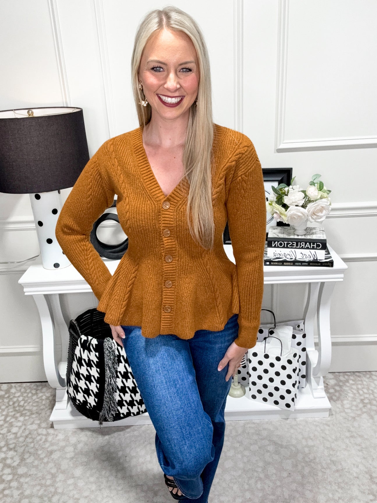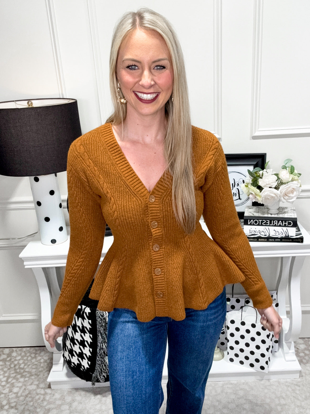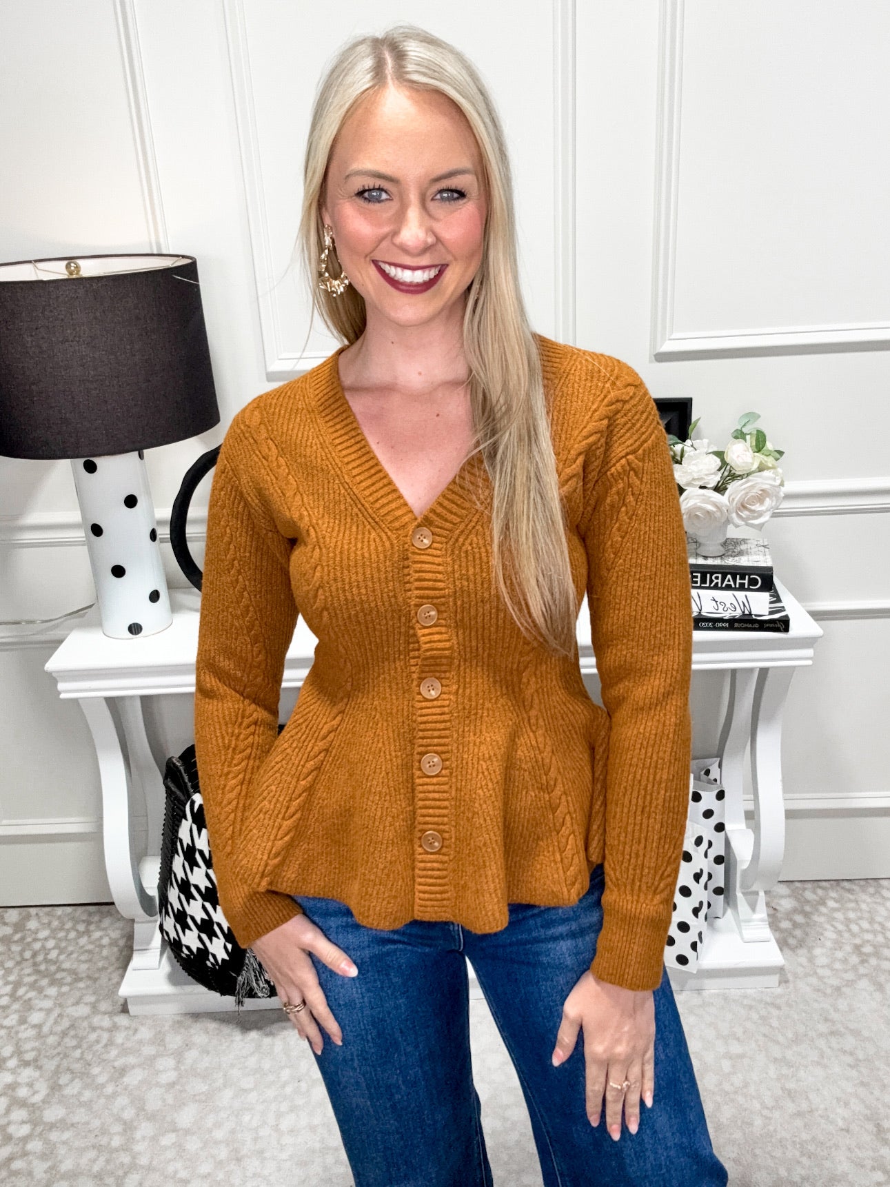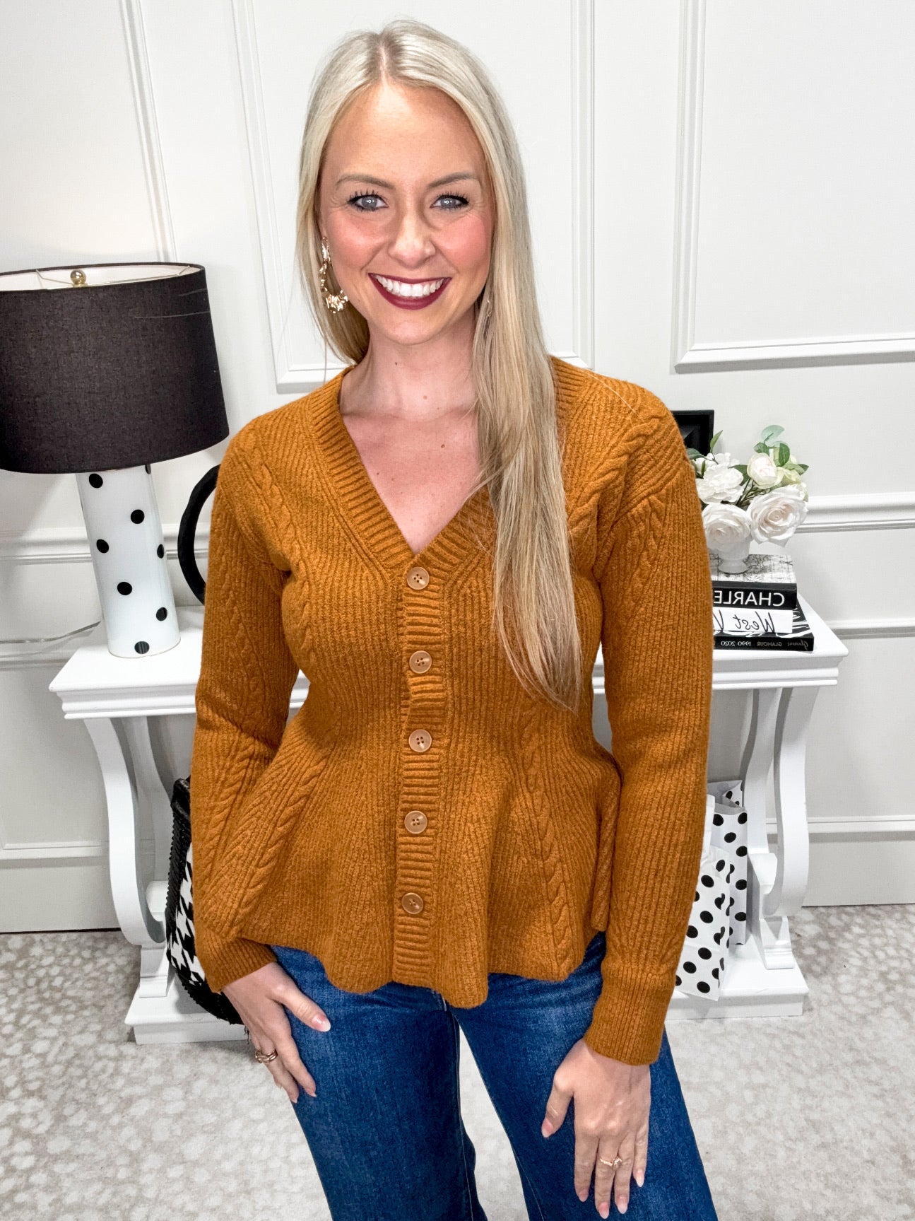 Wrap yourself in cozy charm with the Harriet Sweater. This pumpkin-colored knit features playful twisted stitch details and a flattering peplum silhouette. With a button-front design, it’s easy to layer and perfect for adding a fun, fall-inspired pop to any outfit.