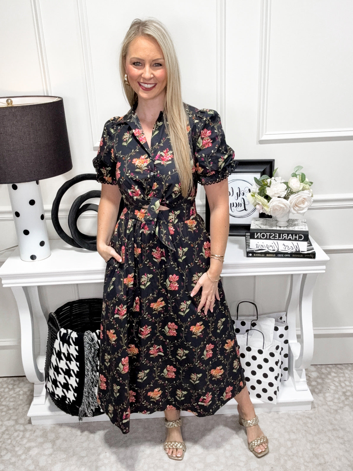 Brighten your day in the Joy Dress—a playful midi with short puff sleeves and a sweet collar. Featuring a cheerful botanical print, partial front buttons, and a waist tie that highlights your shape, it’s as fun as it is flattering. The smocked back waist adds comfort, while scallop-trimmed cuffs and handy side pockets bring charming details. Fully lined, lightweight, and non-sheer, this woven dress is perfect for twirling through any sunny occasion.