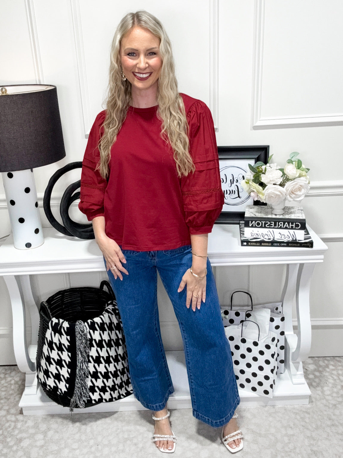 The Libby Top brings a playful twist to your wardrobe with its charming 3/4 puff sleeves and delicate ladder lace trim. Finished with button closure cuffs, this solid top adds a flirty, feminine touch that's perfect for any casual outing or dressy occasion.