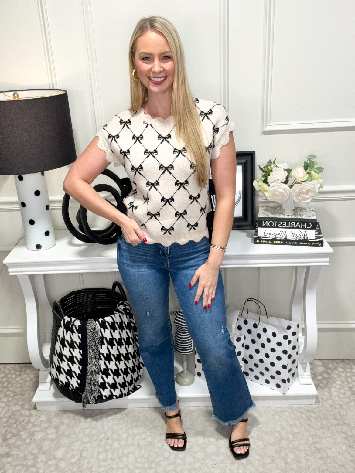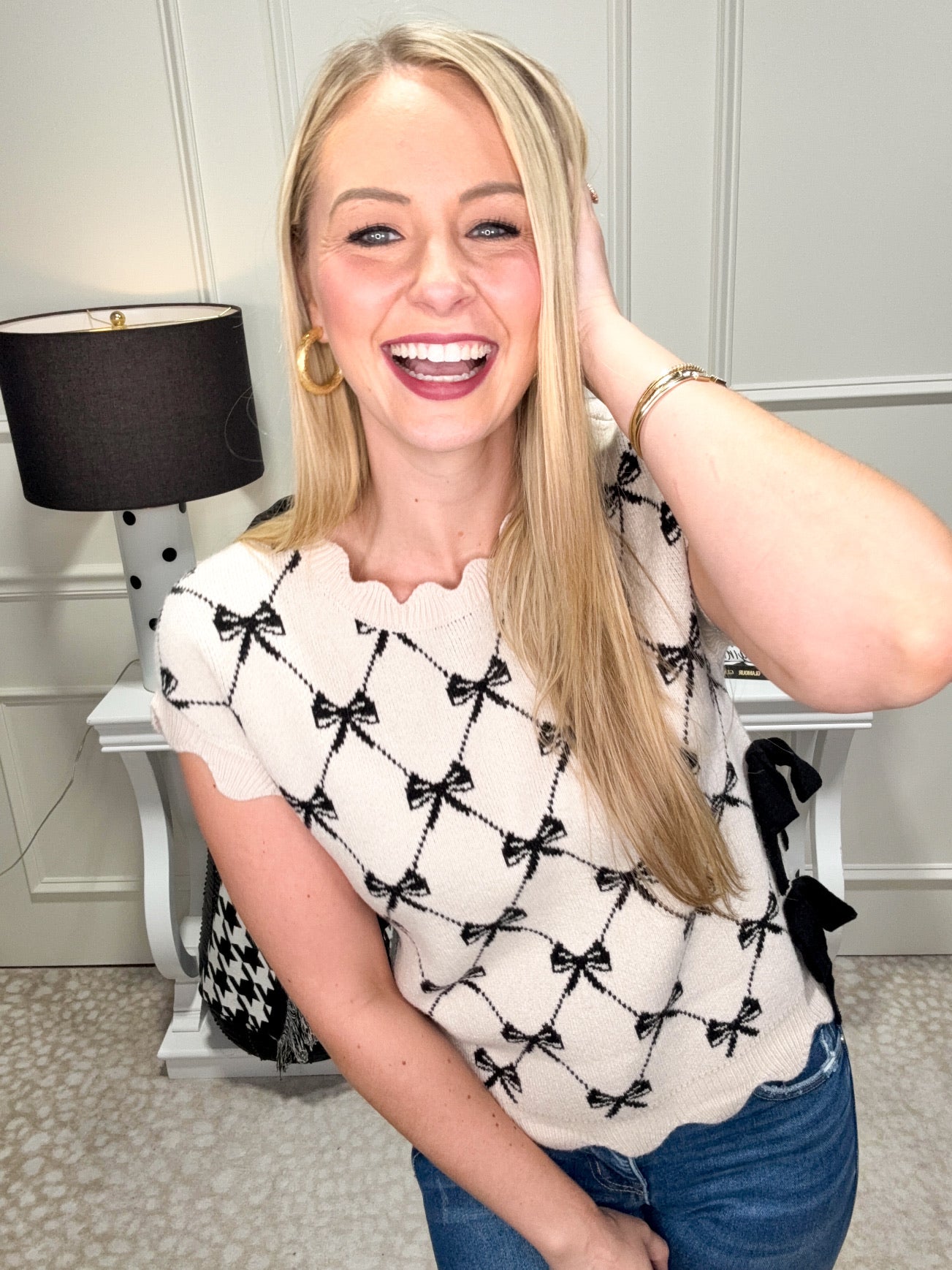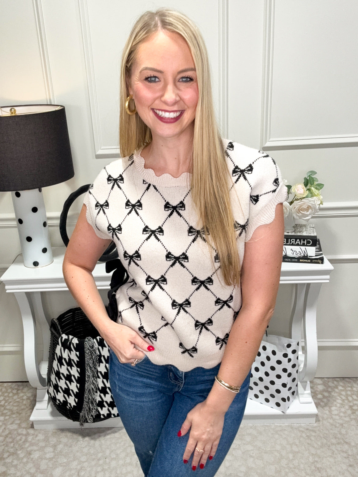 Add a flirty twist to your wardrobe with the Brielle Top. This playful knit pullover features a chic bow pattern and side ties that give you a customizable fit. Its short sleeves keep things light and breezy, perfect for layering or wearing on their own for a fun, casual look.