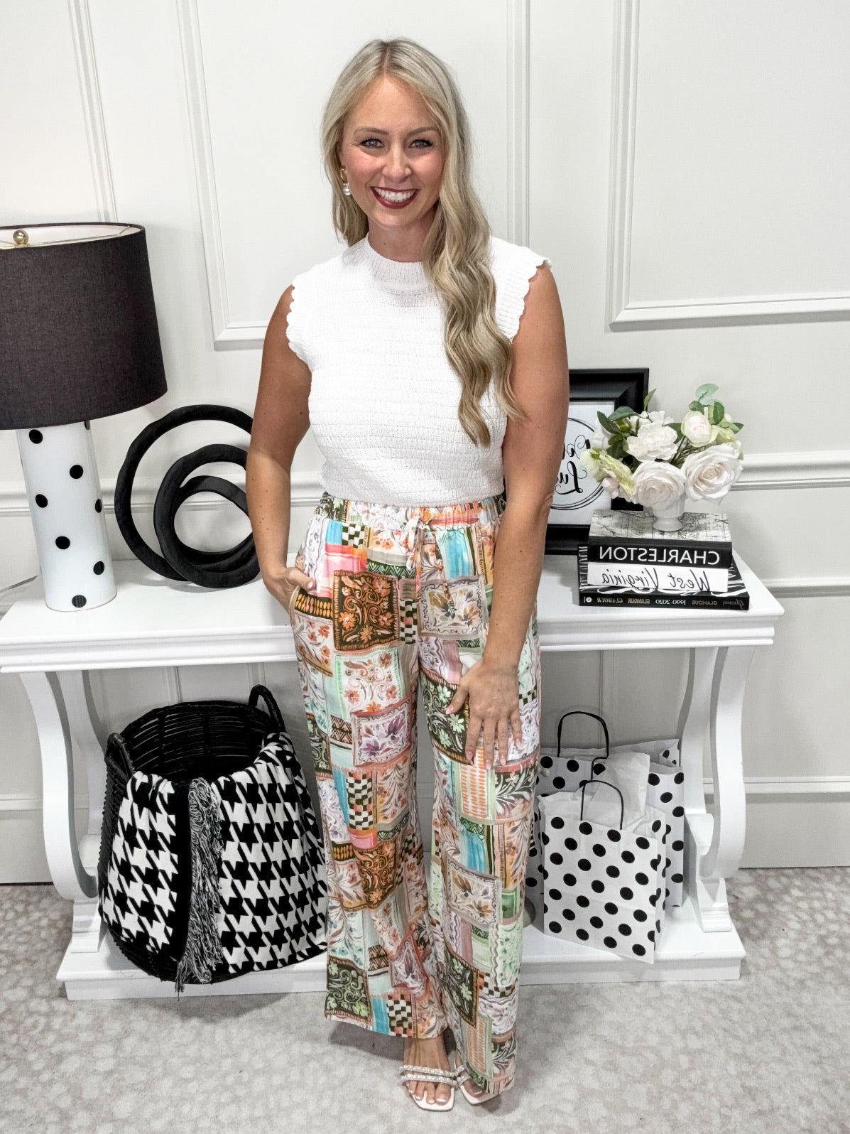 Step into effortless style with the Camilla Pants, featuring a unique patchwork print on a comfy stretch rayon linen blend. These wide-leg palazzo pants offer a relaxed fit with an elastic waist and adjustable tie for the perfect fit. Complete with handy side pockets and a soft lining, they’re as practical as they are playful. Pair them with the matching vest top for a fun, coordinated look that’s ready for any adventure.
