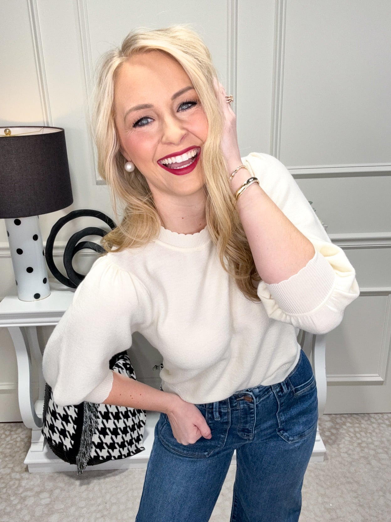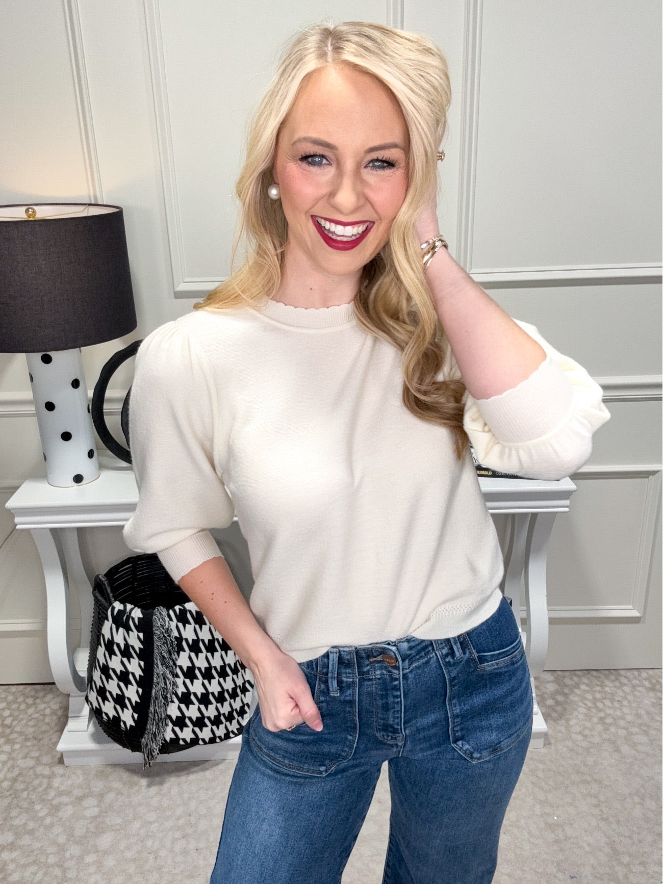 Introducing the Ivy Top—your new go-to for effortless elegance! This charming ivory sweater features delicate 3/4 sleeves and adorable scalloped edges that add a touch of whimsy to any outfit. Perfect for layering or wearing solo, it's the kind of piece that makes you feel put-together without even trying. Cozy, cute, and endlessly versatile—what's not to love?