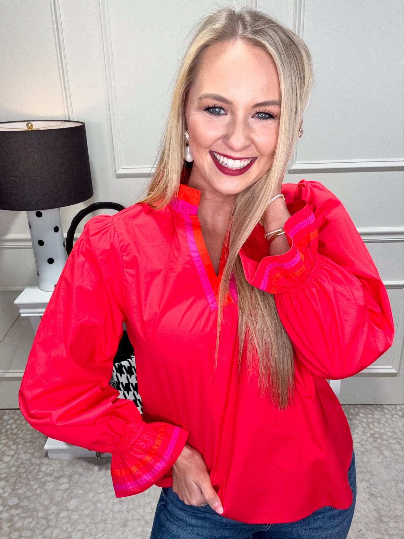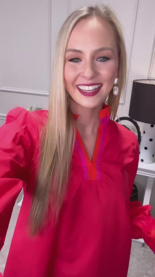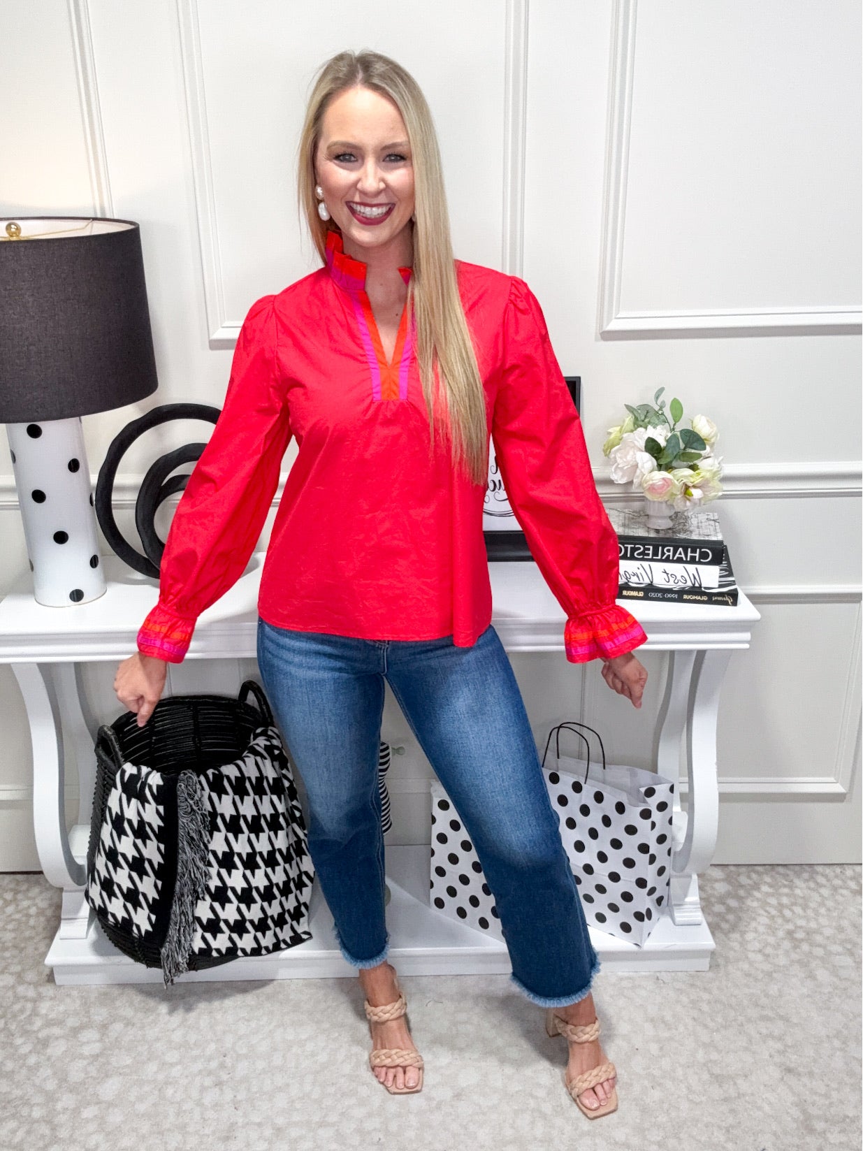 The Katie Top brings a playful touch to your wardrobe with its ruffled long puff sleeves and charming ruffled neckline. Featuring a solid color base accented with a contrasting detail, this top adds a fun, feminine flair to any outfit. Perfect for those who love a mix of classic and whimsical style.