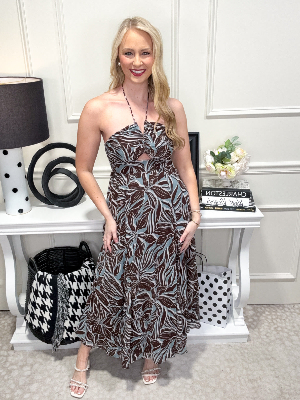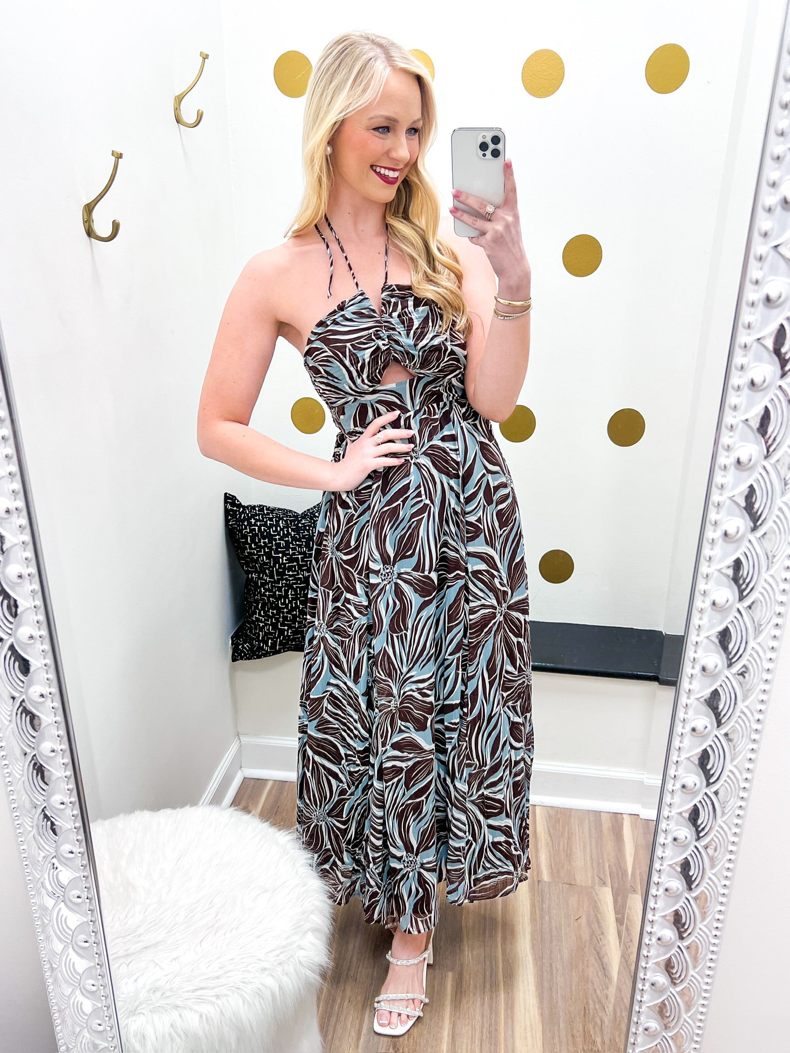 The Lainie Dress is your go-to for effortless elegance with a flirty twist. This stunning maxi features a chic brown print that pairs with everything, a flattering halter neckline that shows off your shoulders, and a daring cutout detail that keeps things interesting. The flowing fabric moves beautifully with you, whether you're heading to brunch or a sunset soirée. Dress it up with heels or keep it casual with sandals—this versatile piece does it all.