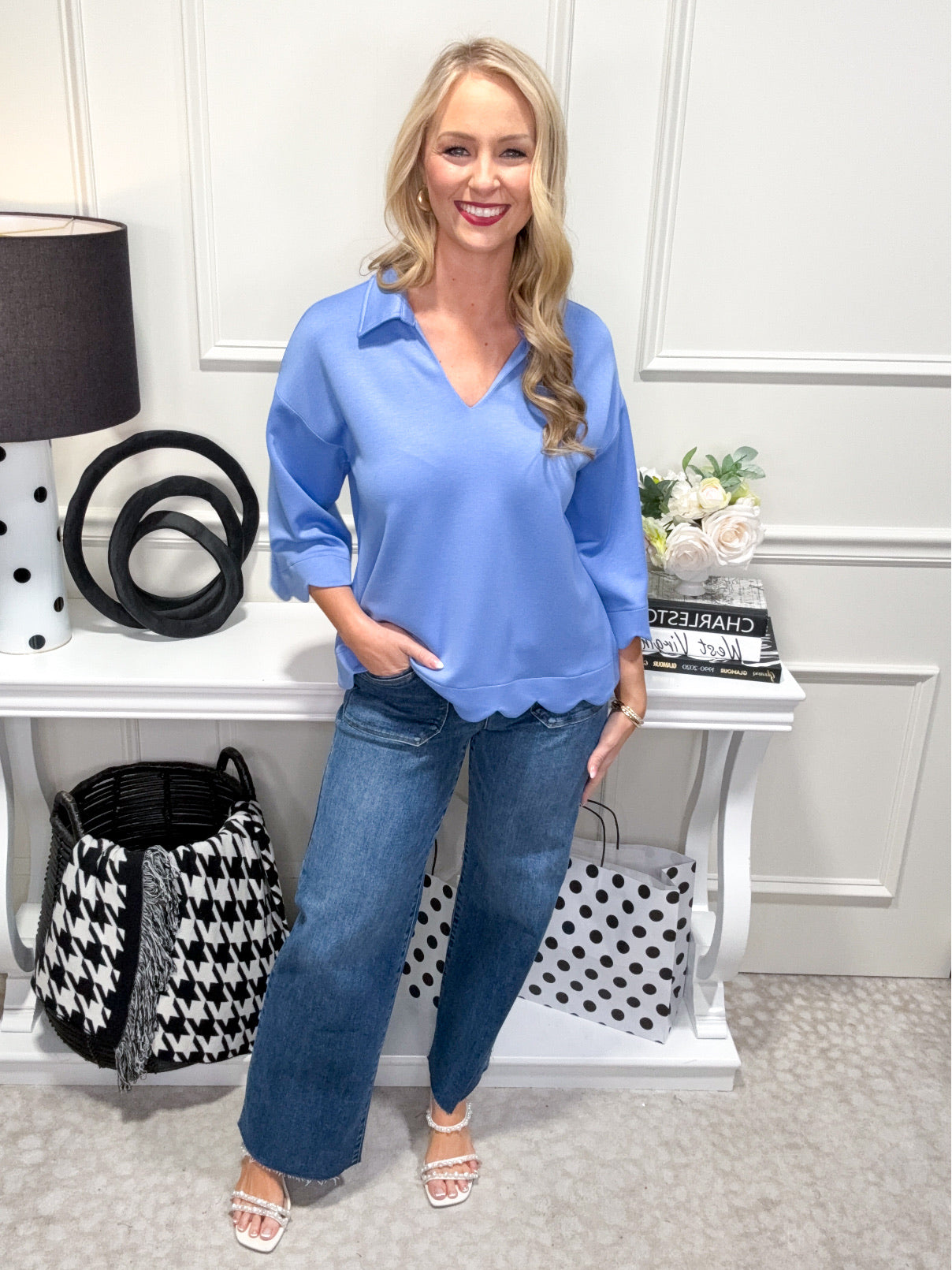 The Mindy Top is your new go-to for effortless style! This charming sky blue piece features a flattering split neck V-collar that adds just the right amount of edge, paired with relaxed 3/4 length sleeves perfect for layering or showing off on their own. The delicate scalloped hem gives it a sweet, feminine finish that elevates any casual look. Whether you're dressing it up with tailored trousers or keeping it cool with your favorite jeans, this versatile top brings playful sophistication to your everyday rotation.