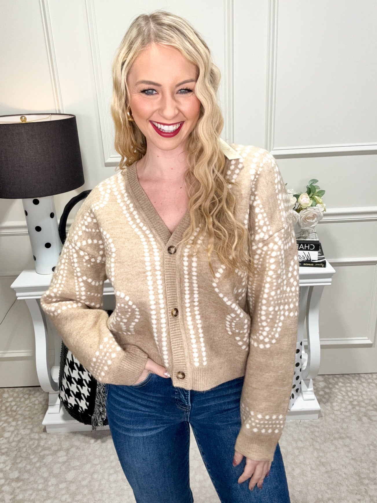 The Sierra Cardigan is your new go-to layer for effortless style. This charming knit features a flattering V-neck and classic button-down front, perfect for layering over your favorite tees or dresses. Long sleeves and an eye-catching pattern make it versatile enough for casual weekends or dressed-up occasions. Cozy, chic, and endlessly wearable—slip it on and feel the difference.