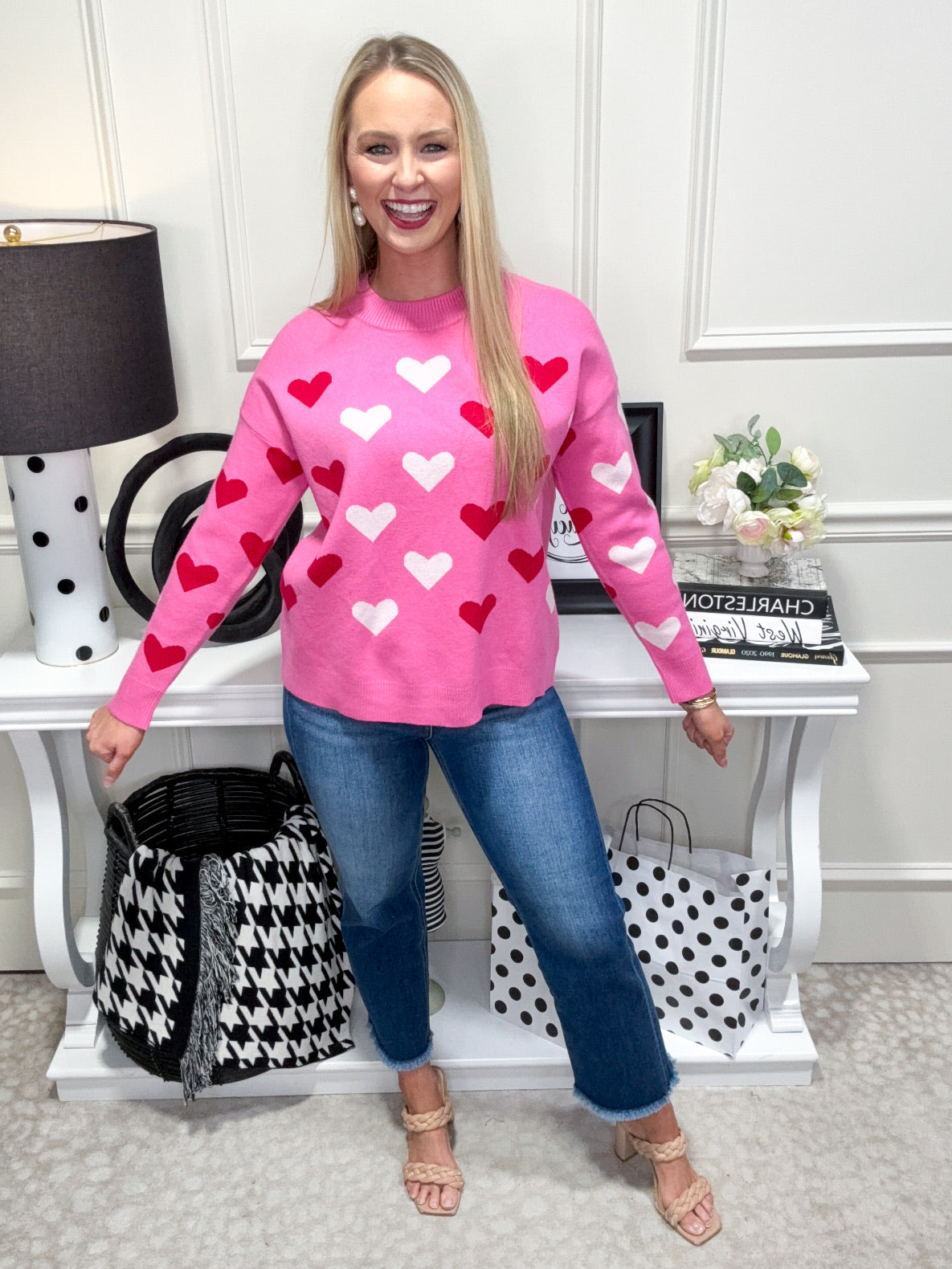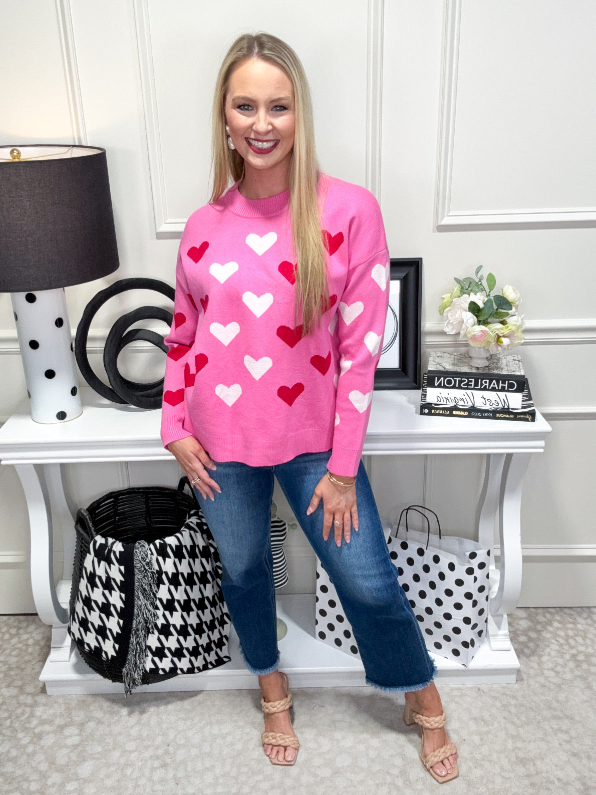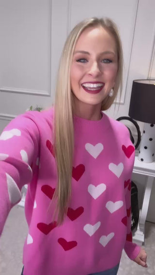 Wrap yourself in cozy charm with the Winnie Sweater, a delightful long-sleeve pullover featuring adorable valentine hearts scattered across a soft crew neck design. Perfect for spreading love and warmth all season long, this playful sweater brings a touch of whimsy to your everyday wardrobe. Whether you're celebrating the season of love or simply want to add a cheerful pop of personality to your closet, this charming piece is sure to make hearts flutter.