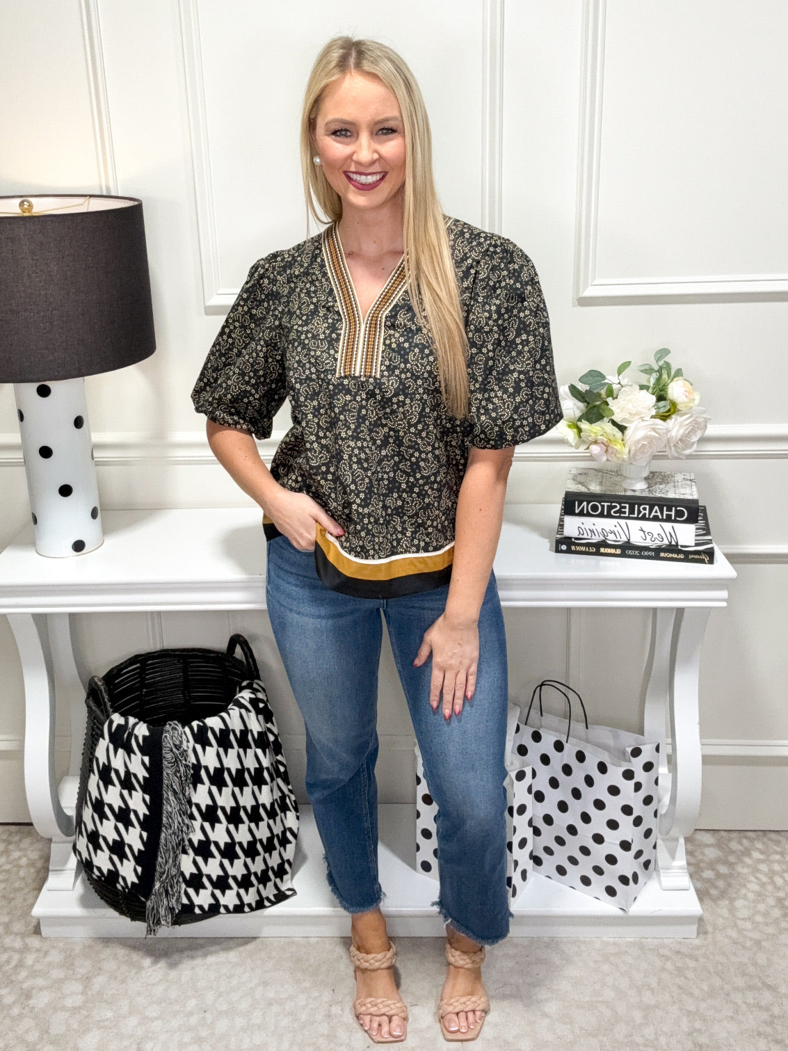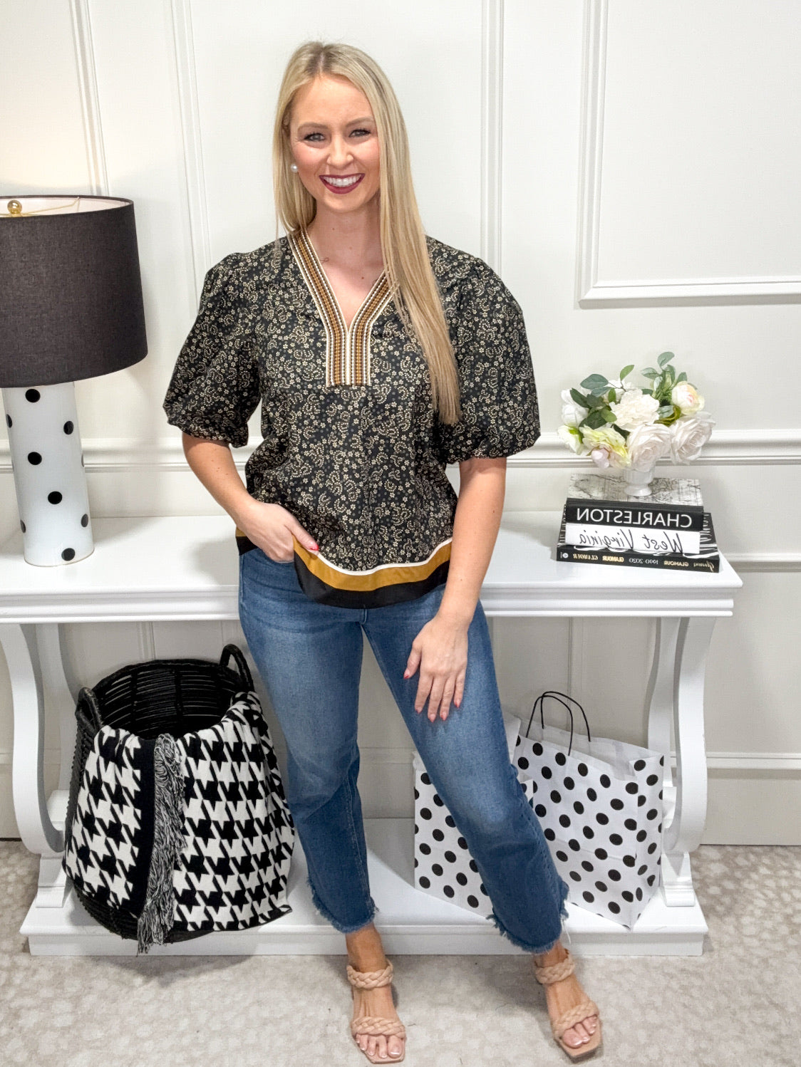 Add a dash of fun to your wardrobe with the Greer Top! Featuring playful puff sleeves and a flattering V-neck, this woven printed top is finished with a vibrant color block hem for an extra pop. It’s perfect for mixing and matching while keeping your look lighthearted and fresh.