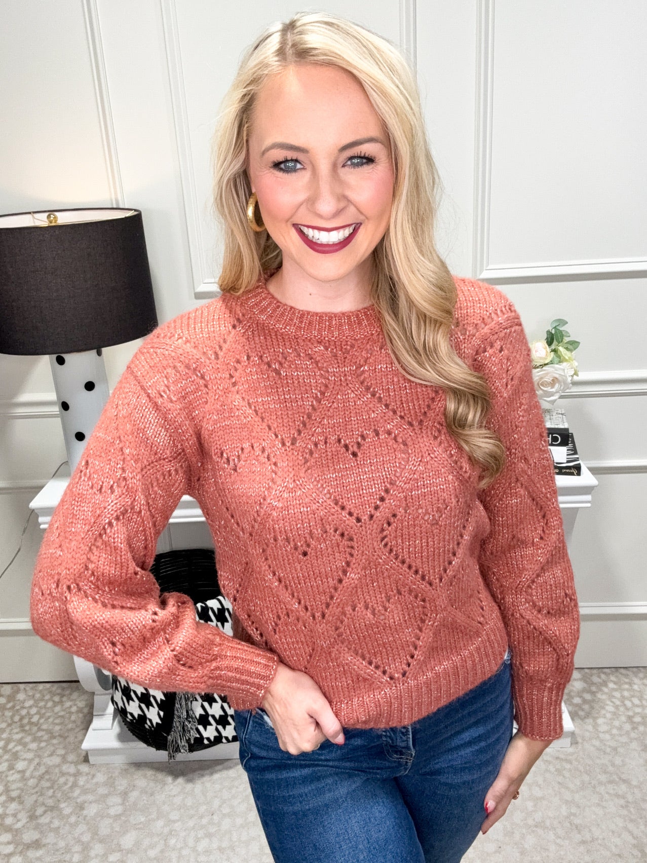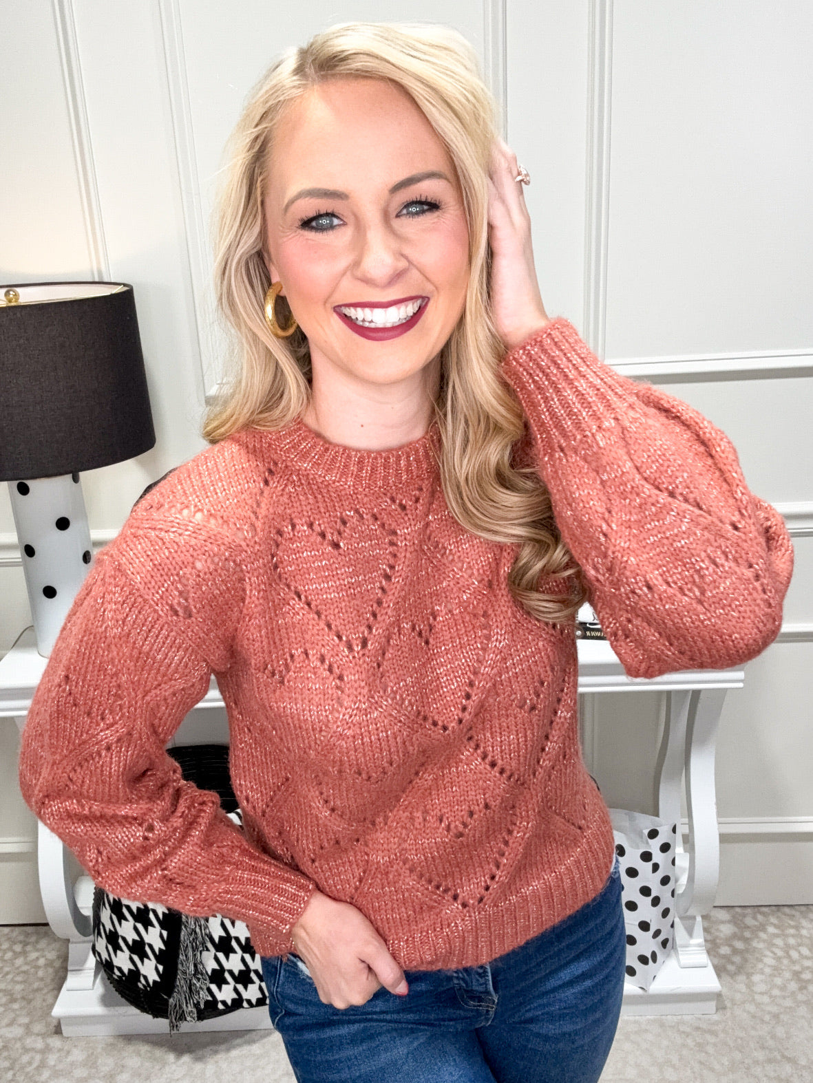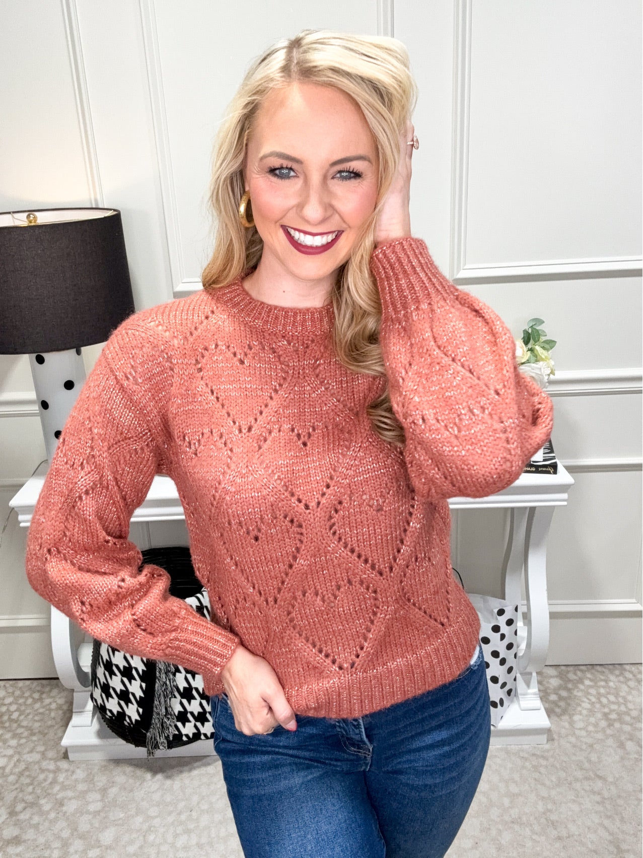 Stay cozy and chic with our Isabelle Sweater! This long-sleeved sweater features slightly balloon sleeves and a round neckline. Its heart-shaped openwork knit on the front, back, and sleeves adds a touch of whimsy, while the lurex threads give it a hint of sparkle. Perfect for adding a pop of fun to your wardrobe (and staying warm)!