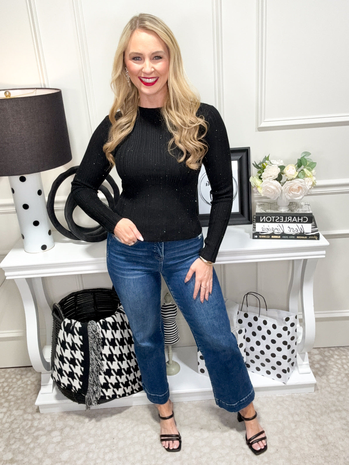 Get ready to sparkle in the Karlie Sweater! This slim-fit, thin ribbed knit top hugs you just right, while rhinestone studs add a fun, twinkling touch. With long sleeves and a chic semi-stand-up collar, it’s playful yet polished. The raw edge finish gives it a cool, effortless vibe perfect for day or night.