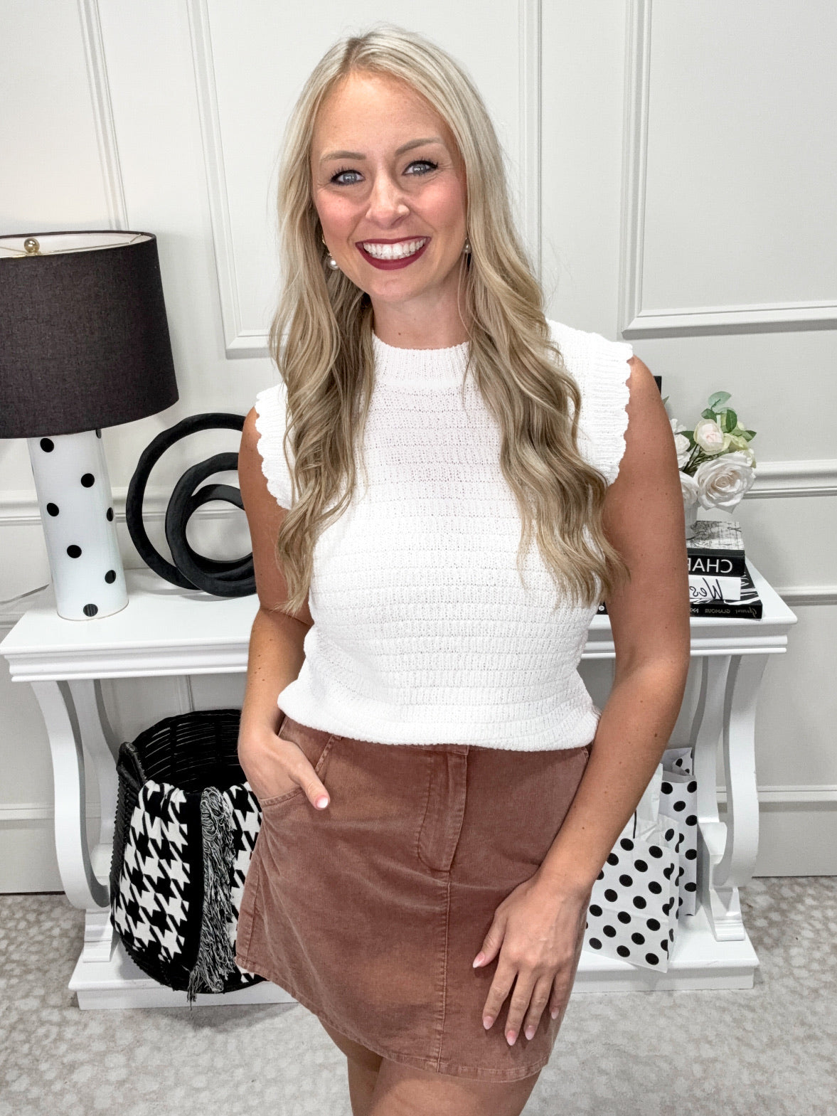 The Palmer Top is an ivory sweater vest with short sleeves that brings a playful twist to your wardrobe. Its cute, flattering fit makes it perfect for layering or wearing on its own, adding a cozy yet stylish touch to any outfit. Embrace comfort and charm effortlessly with this versatile piece.